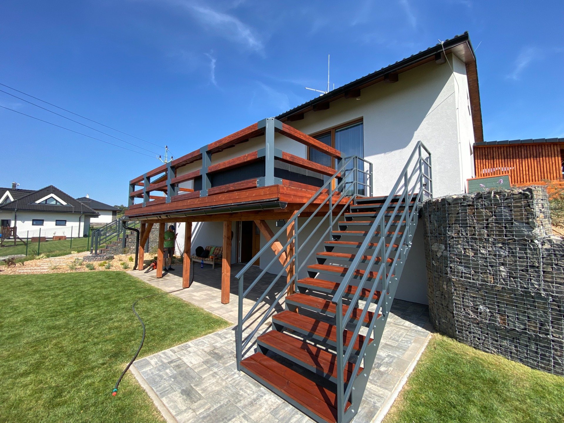 Zahrada v Novém Hrádku prošla kompletní revitalizací včetně úprav terénu a výsadby nové zeleně. Součástí realizace byla také pokládka dlažby před domem, výstavba nového plotu, gabionového schodiště a ohniště. Celý prostor doplňuje prostorná terasa, která se stala dominantním prvkem zahrady.